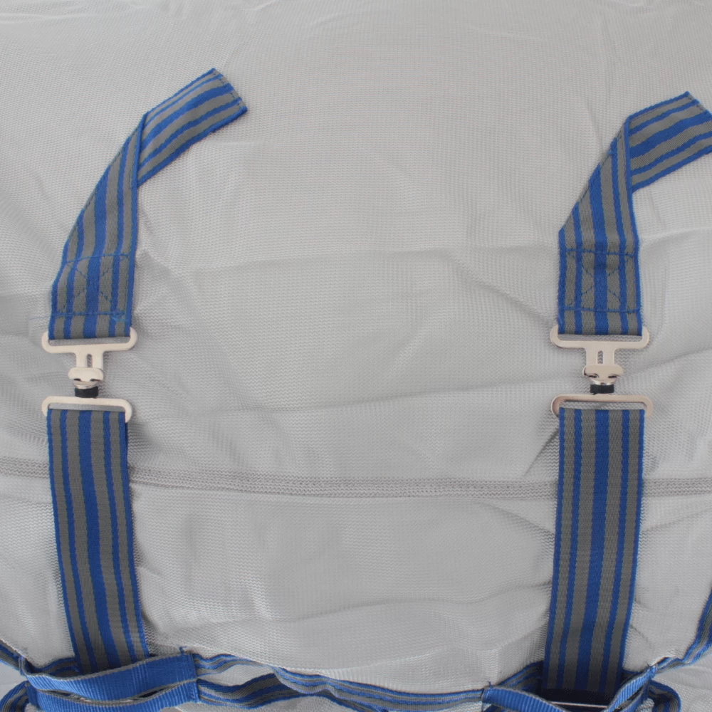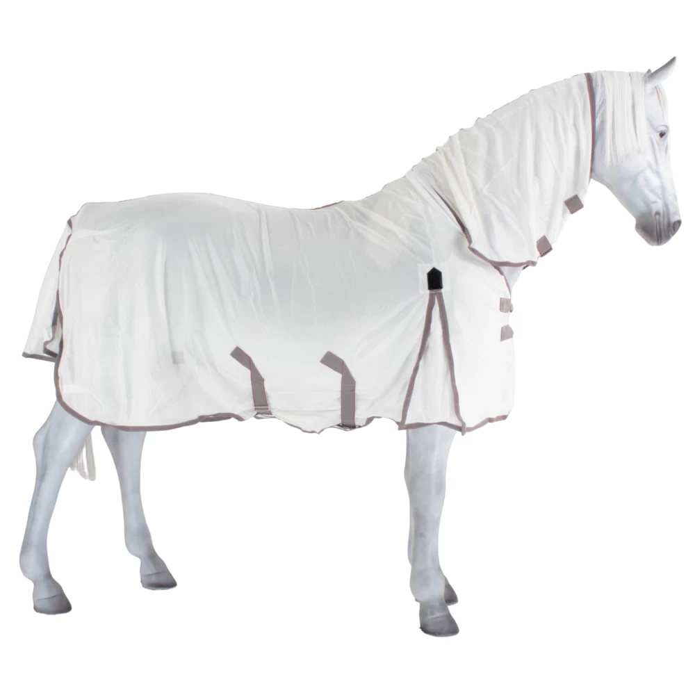 Im Frontbereich der Decke wird diese mit zwei stabilen Karabinerhaken verschlossen, dabei kann man über zwei verschiedene Weiten die Decke optimal ans Pferd anpassen. Der Bauchlatz wird mit zwei verstellbaren Gurten verschlossen. Des weiteren verfügt die Decke über abnehmbare, elastische und verstellbare Beinschnüre. Das Halsteil wird mit zwei breiten Klettverschlüssen gesichert.