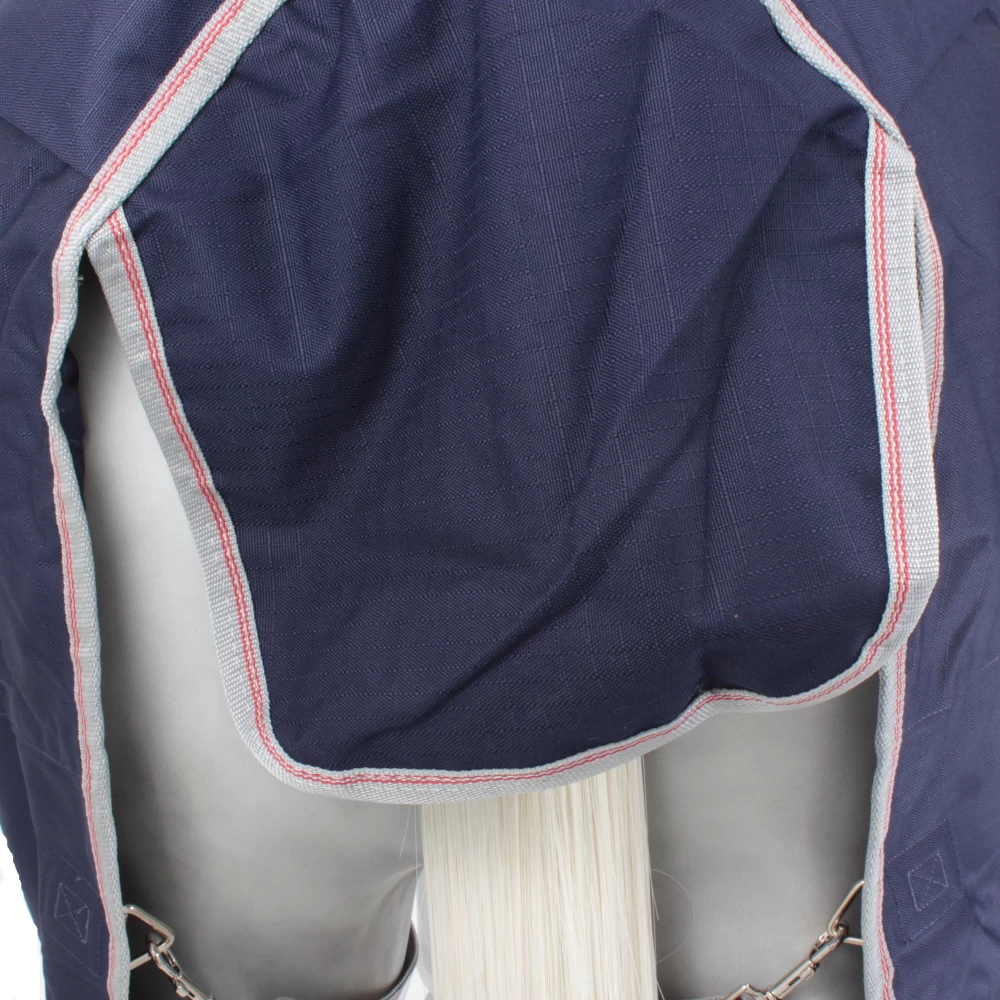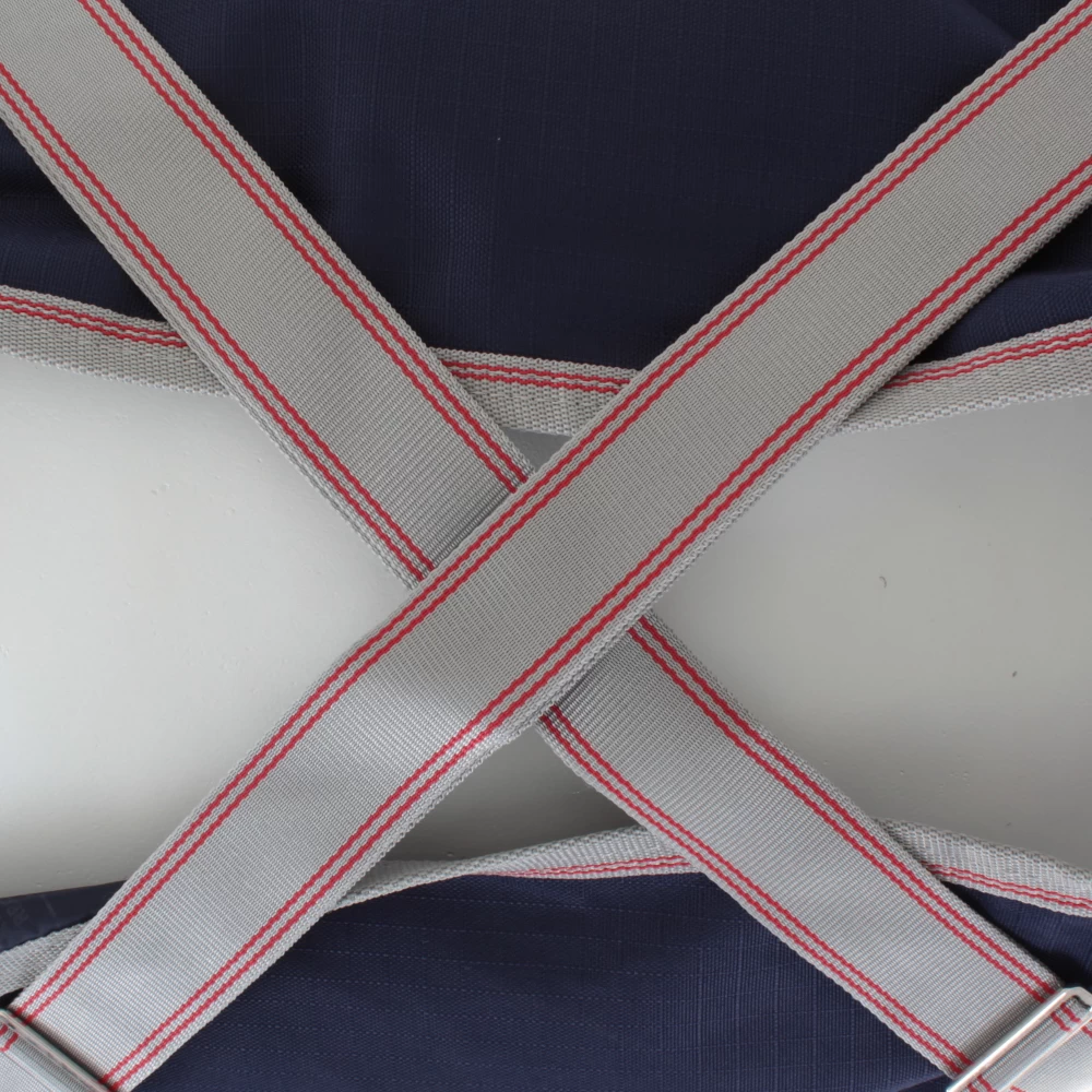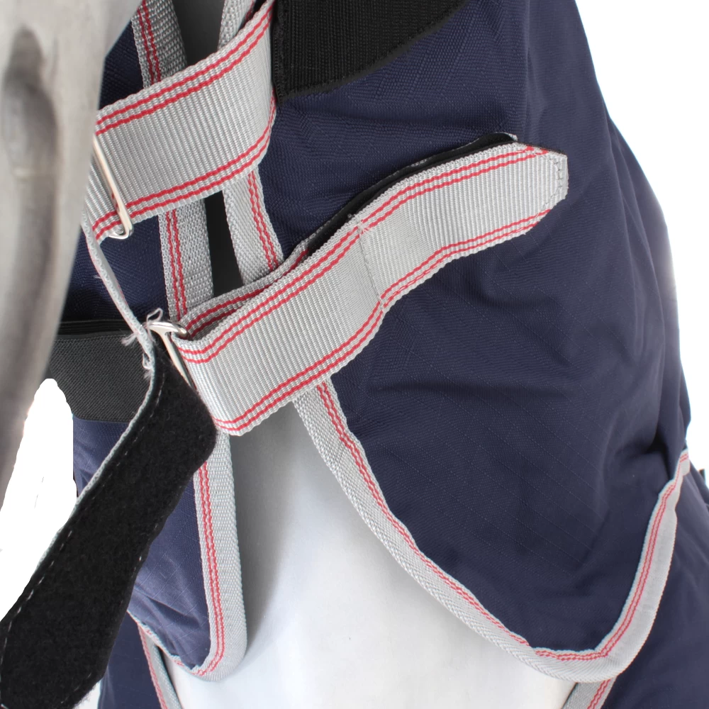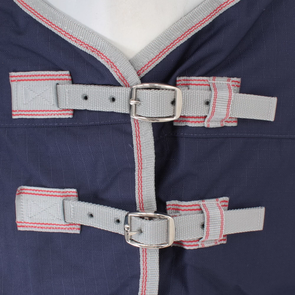 Im Frontbereich der Decke wird diese mit zwei verstellbaren Schnallen verschlossen. Die Kreuzbegurtung ist tief angesetzt und optimal verstellbar. Des weiteren verfügt die Decke über abnehmbare und verstellbare Beinschnüre und einen Schweifriemen. Das abnehmbare Halsteil wird über zwei optimal anpassbare Klettverschlüsse geschlossen.