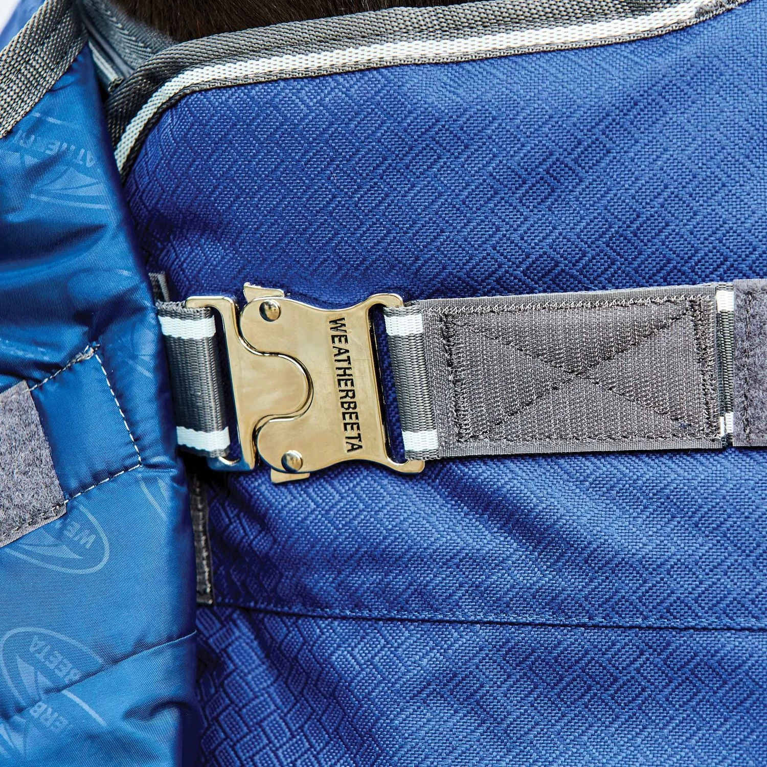 Der überlappende Brustbereich ist angenehm anschmiegsam und der Ezi-Buckle-Verschluss steht für ein Optimum an Sicherheit. Die Kreuzbegurtung ist tief angesetzt und optimal verstellbar. Des weiteren verfügt die Decke über abnehmbare, elastische und verstellbare Beinschnüre und einen Schweifriemen. Die Decke ist im Halsbereich mit Ösen ausgestattet, an diesen kann das Halsteil befestigt werden. Verschlossen wird dies mit zwei breiten, elastischen und mit einem Umschlag versehenen Klettverschlüssen.