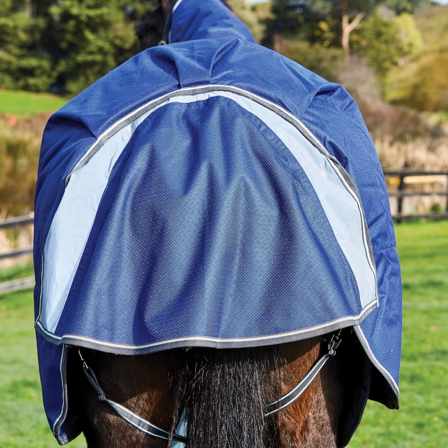 Das dreifach genähte Ripstop Gewebe aus 1200 Denier Obermaterial ist extrem robust und reißfest und dadurch äußerst langlebig. Die besondere Repel Shell Imprägnierung der Außenhaut macht diese Decke wasserdicht und atmungsaktiv zugleich. Das angenehm weiche Innenfutter aus 210 Denier Polyester-Gewebe und die 100g Füllung erhöhen den Tragekomfort der Decke. Das abnehmbare Halsteil und der große Schweiflatz komplettieren den perfekten Schutz für’s Pferd. Die Gehfalten im Bereich der Vorderhand geben ihm genügend Raum für Bewegung. Der Clou ist das Widerristpad aus formspeicherndem Schaumstoff, das sich den Konturen des Pferdes anpasst und die Decke über dem Widerrist anhebt, Reibung und Druckstellen werden vermieden. Auch für gute Sichtbarkeit ist gesorgt mit Reflektorstreifen am Schweiflatz und in den Gehfalten.