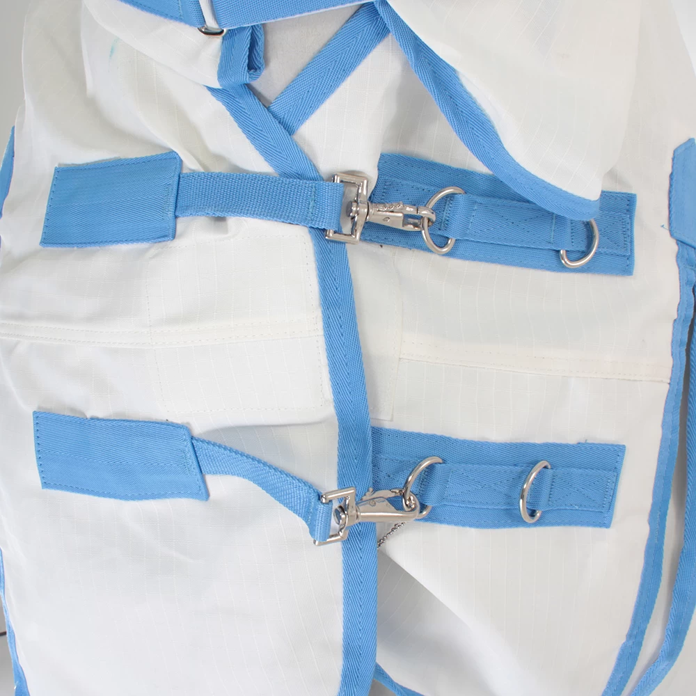 Im Brustbereich wird die Decke mit zwei praktischen Ezi-Clip-Verschlüssen schnell und sicher verschlossen, natürlich längenverstellbar. Das Halsteil lässt sich über breite Klettverschlüsse schließen. Der Bauchlatz wird mit drei optimal anpassbaren Gurten verschlossen und ein Schweifriemen komplettiert den sicheren Sitz.