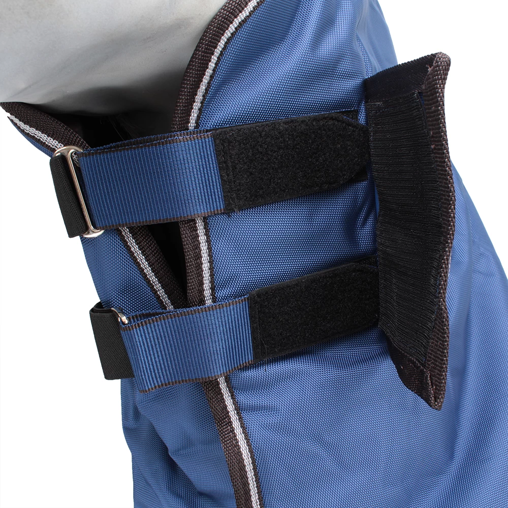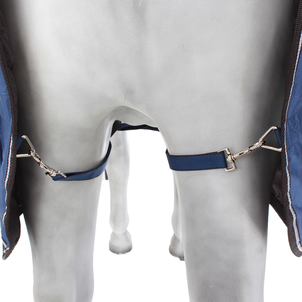Im Frontbereich der Decke wird diese mit zwei stabilen Karabinerhaken verschlossen, dabei kann über zwei verschiedene Weiten die Decke optimal an’s Pferd anpassen. Die Kreuzbegurtung ist tief angesetzt und leicht verstellbar. Des Weiteren verfügt die Decke über abnehmbare, elastische und verstellbare sowie abgepolsterte Beinschnüre. Die Decke ist im Halsbereich mit breiten Klettstreifen ausgestattet an denen das Halsteil befestigt wird. Verschlossen wird dies mit zwei breiten, elastischen und mit einem Umschlag versehenen Klettverschlüssen.