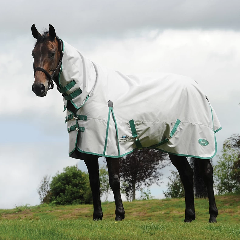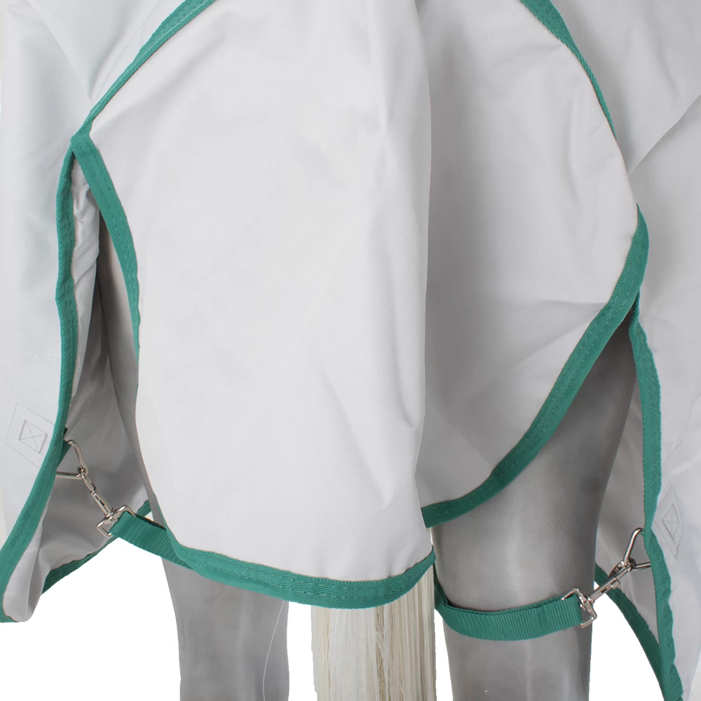 Das robuste Obermaterial aus 900 Denier PCR (POST-CONSUMER-RECYCELTEN PLASTIK) ist wunderbar atmungsaktiv und dabei absolut wasserdicht. Das weiche Innenfutter aus 150 Denier PCR lässt die Decke angenehm auf dem Pferd liegen. Die leichte 50g Füllung der Regendecke eignet sich perfekt für regnerische Tage im Sommer und die Übergangszeit. Die helle, das Sonnenlicht reflektierende Farbe schützt auch vor Überhitzung. Das fest integrierte Halsteil ist angenehm für Pferde mit Problemen am Widerrist, da keine lästige Naht scheuern kann. Der große Schweiflatz komplettiert den perfekten Schutz für’s Pferd. Die Gehfalten im Bereich der Vorderhand geben ihm genügend Raum für Bewegung.