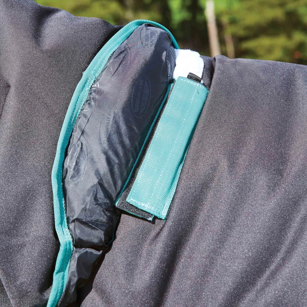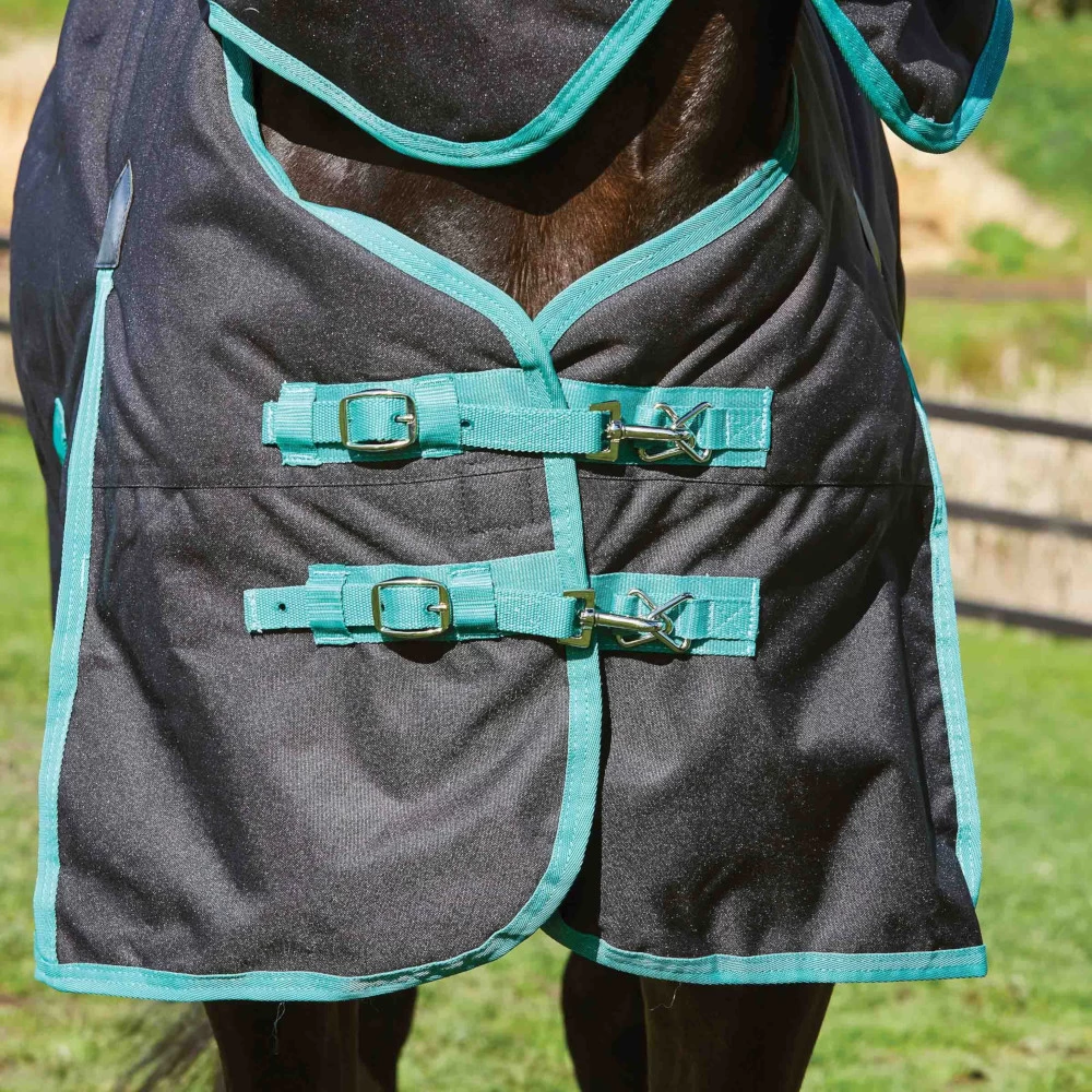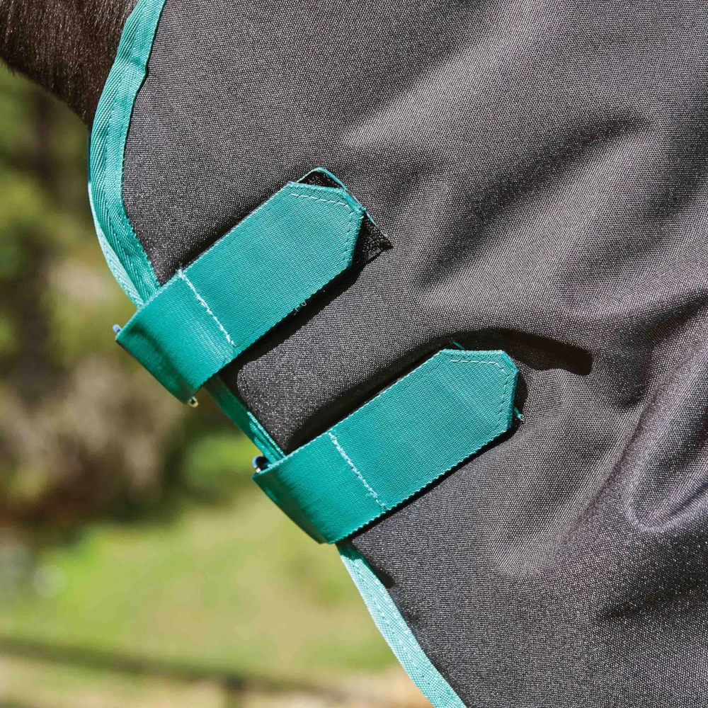Im Frontbereich der Decke wird diese mit zwei stabilen Karabinerhaken verschlossen, dabei kann man über zwei verschiedene Weiten die Decke optimal an’s Pferd anpassen. Die Kreuzbegurtung ist tief angesetzt und verstellbar. Des weiteren verfügt die Decke über abnehmbare und verstellbare Beinschnüre. Die Decke ist im Halsbereich mit Klett ausgestattet, an denen das Halsteil befestigt wird. Verschlossen wird dies mit zwei breiten Klettverschlüssen.