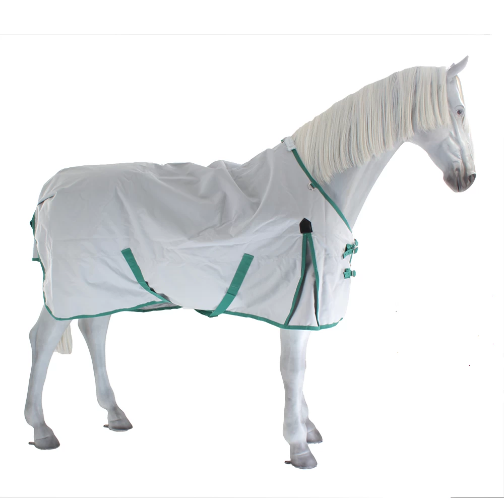 Das robuste Obermaterial aus 900 Denier PCR (POST-CONSUMER-RECYCELTEN PLASTIK) ist wunderbar atmungsaktiv und dabei absolut wasserdicht. Das weiche Innenfutter aus 150 Denier PCR lässt die Decke angenehm auf dem Pferd liegen. Die leichte 50g Füllung der Regendecke eignet sich perfekt für regnerische Tage im Sommer und die Übergangszeit. Die helle, das Sonnenlicht reflektierende Farbe schützt auch vor Überhitzung. Der große Schweiflatz komplettiert den perfekten Schutz für’s Pferd. Die Gehfalten im Bereich der Vorderhand geben ihm genügend Raum für Bewegung.
