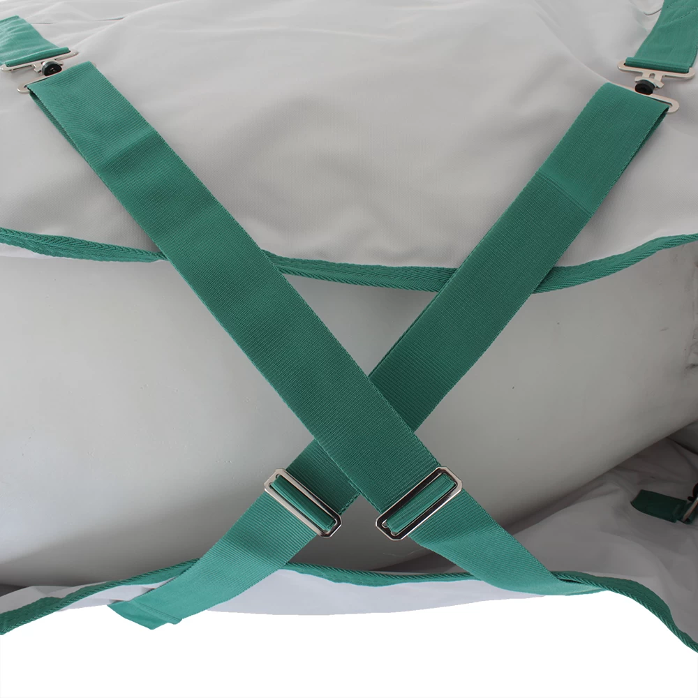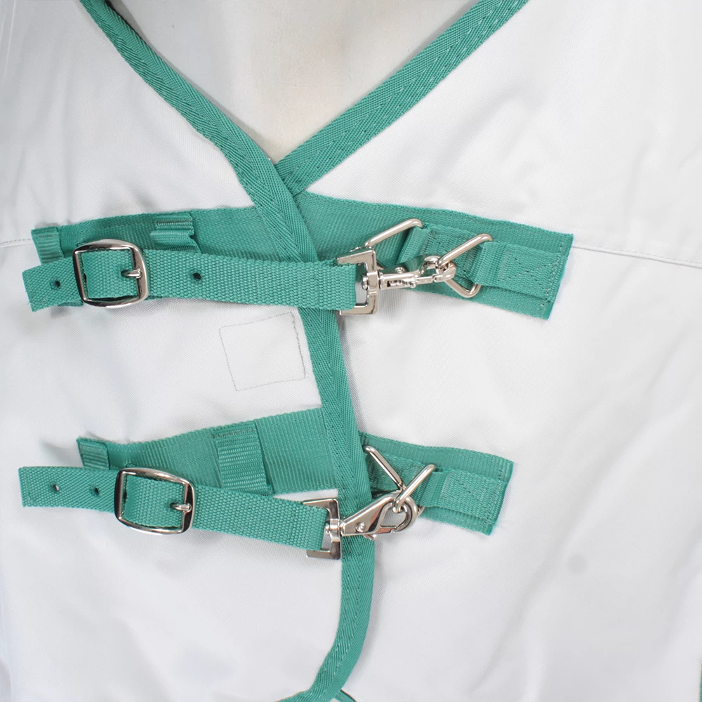 Im Frontbereich der Decke wird diese mit zwei stabilen Karabinerhaken verschlossen, dabei kann man über zwei verschiedene Weiten die Decke optimal an’s Pferd anpassen. Die Kreuzbegurtung ist tief angesetzt und verstellbar. Des weiteren verfügt die Decke über abnehmbare und verstellbare Beinschnüre.