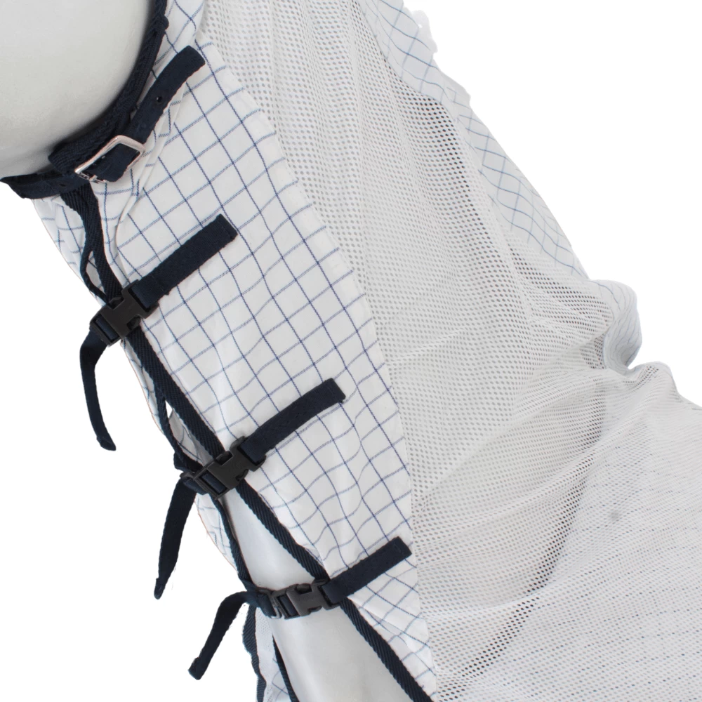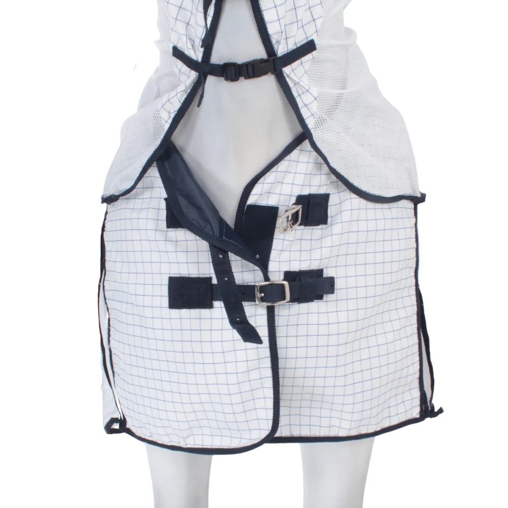 Die Kool Coat Sommerdecke mit integriertem Halsteil ist aus einem leichten, luftdurchlässigen und hoch atmungsaktiven 270g Polyestergewebe. Das Hightech-Gewebe bietet dem Pferd einen UV-Schutz von über 90 %. Im Schulterbereich sorgt ein integriertes, seidiges Nyloninnenfutter für hohen Tragekomfort.