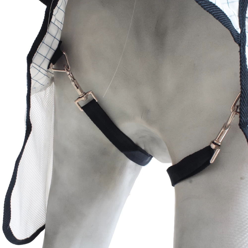 Die Decke ist klassisch geschnitten und mit großzügigen Gehfalten, für optimale Bewegungsfreiheit ausgestattet. Am Bauch wird die Decke mit einer größenverstellbaren Kreuzbegurtung geschlossen. Der Frontverschluss besteht aus einem doppelten, verstellbaren Schnallenverschluss. Für den optimalen Sitz wird die Decke mit zwei praktischen, größenverstellbaren Beinschnüren geliefert, welche nach Bedarf auch abgenommen werden können.