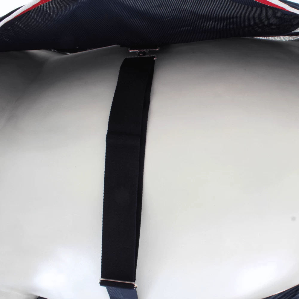 Im Frontbereich der Decke wird diese mit einer verstellbaren Schnallen verschlossen. Der einzelne Bauchgurt ist abnehmbar und optimal verstellbar. Ein tief angesetzter Schweifriemen sorgt zusätzlich für den sicheren Sitz der Decke.
