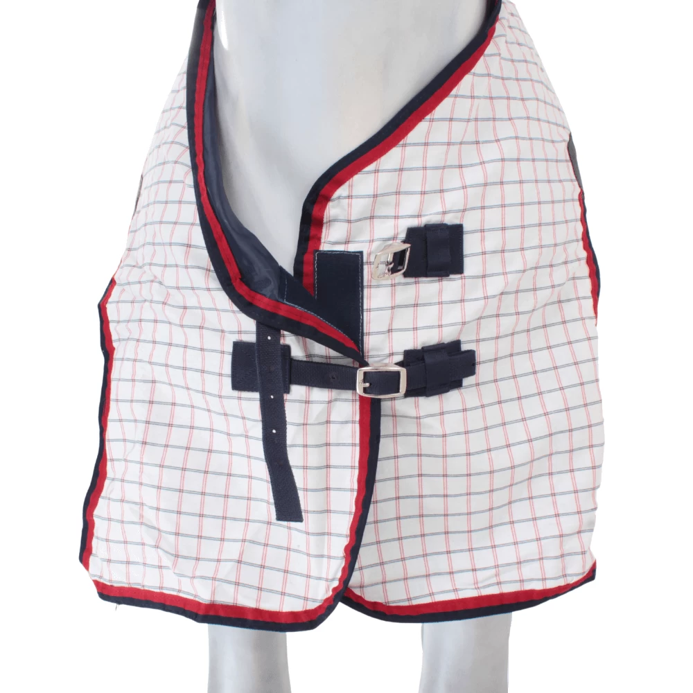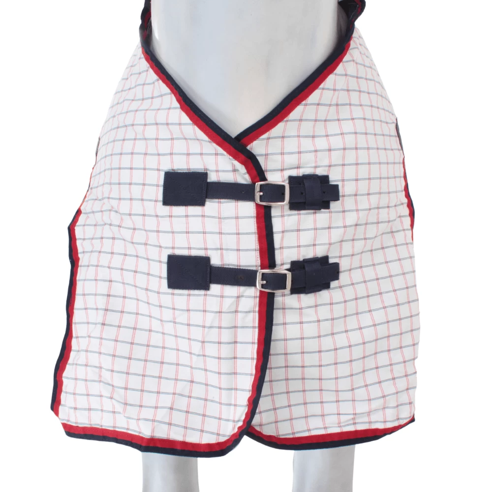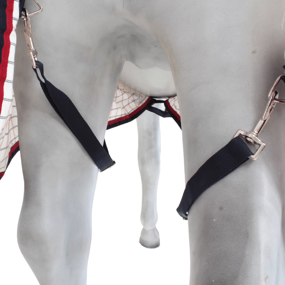 Die Decke ist mit großzügigen Gehfalten, für optimale Bewegungsfreiheit ausgestattet. Am Bauch wird die Decke mit einer größenverstellbaren Kreuzbegurtung geschlossen. Der Frontverschluss besteht aus einem doppelten verstellbaren Schnallenverschluss. Für den optimalen Sitz wird die Decke mit zwei elastischen, größenverstellbaren Beinschnüren geliefert, welche nach Bedarf auch abgenommen werden können.