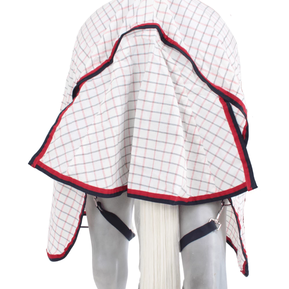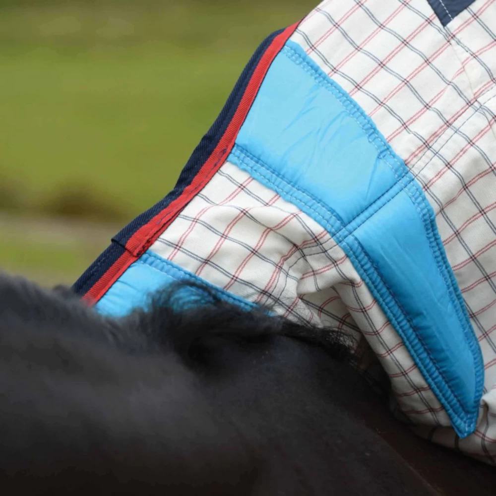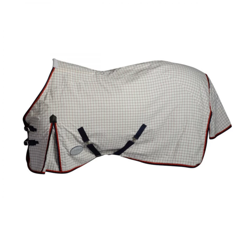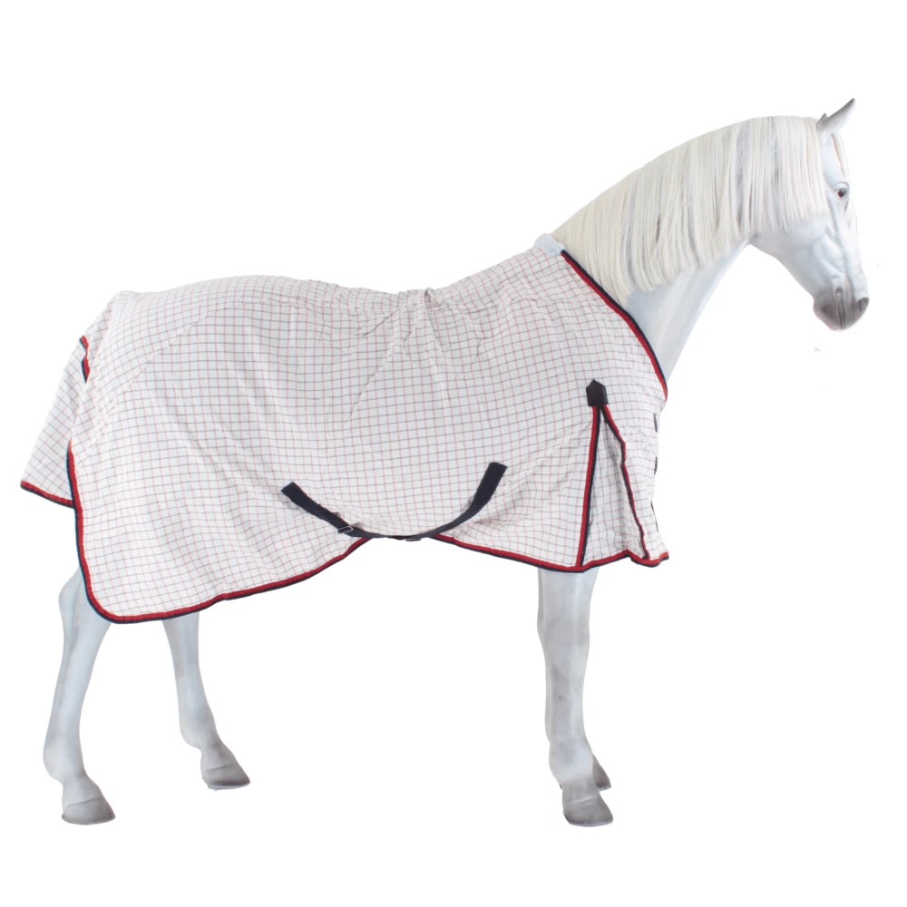 Die Sommerdecke ist aus einem leichten, luftdurchlässigen und hoch atmungsaktiven Polycotton Gewebe. Das Hightech-Gewebe bietet dem Pferd einen UV-Schutz von 95+ %. Im Brust-, Mähnen-, Schulter- und Schweifansatzbereich sorgt ein seidiges Nyloninnenfutter für hohen Tragekomfort. Im Bereich des Widerrists verhindert ein spezielles Pad Scheuerstellen und entlastet gleichzeitig den Widerrist.