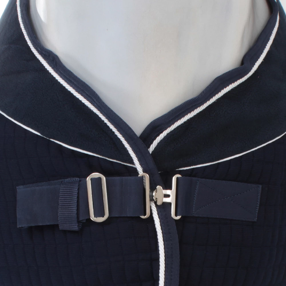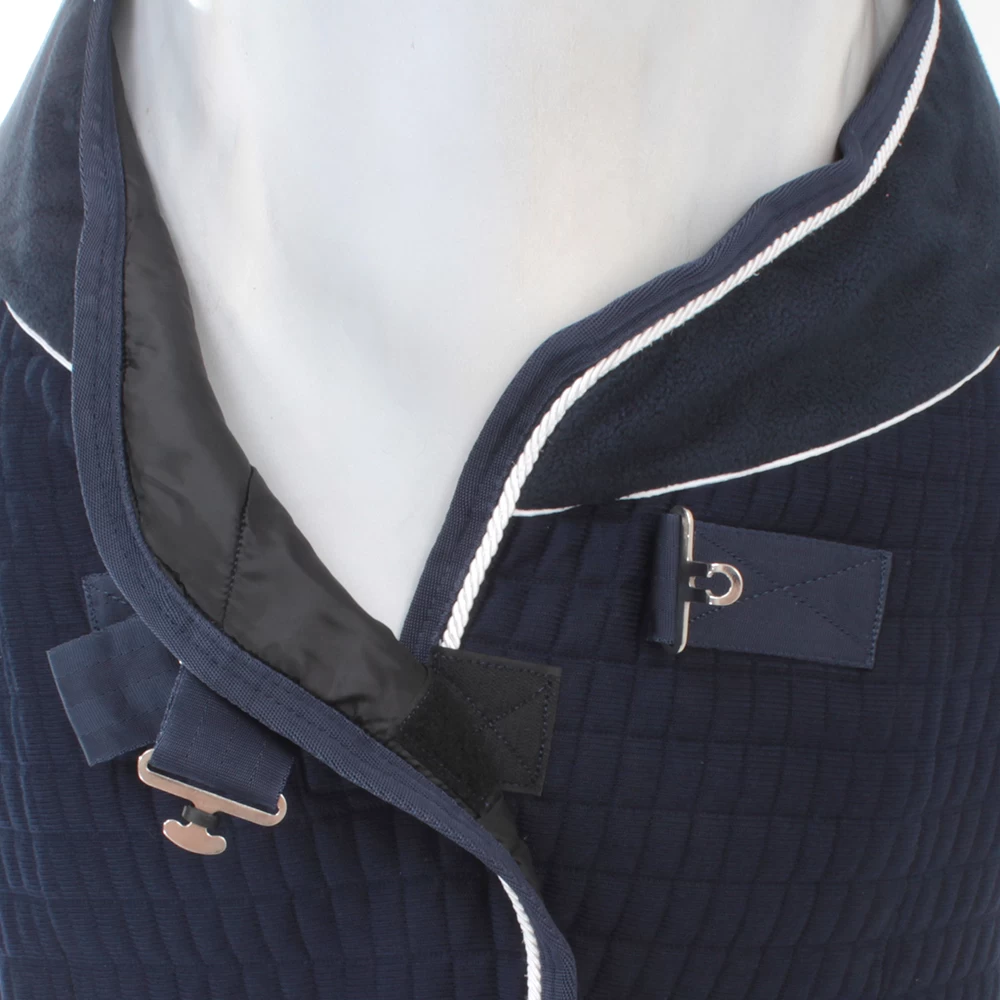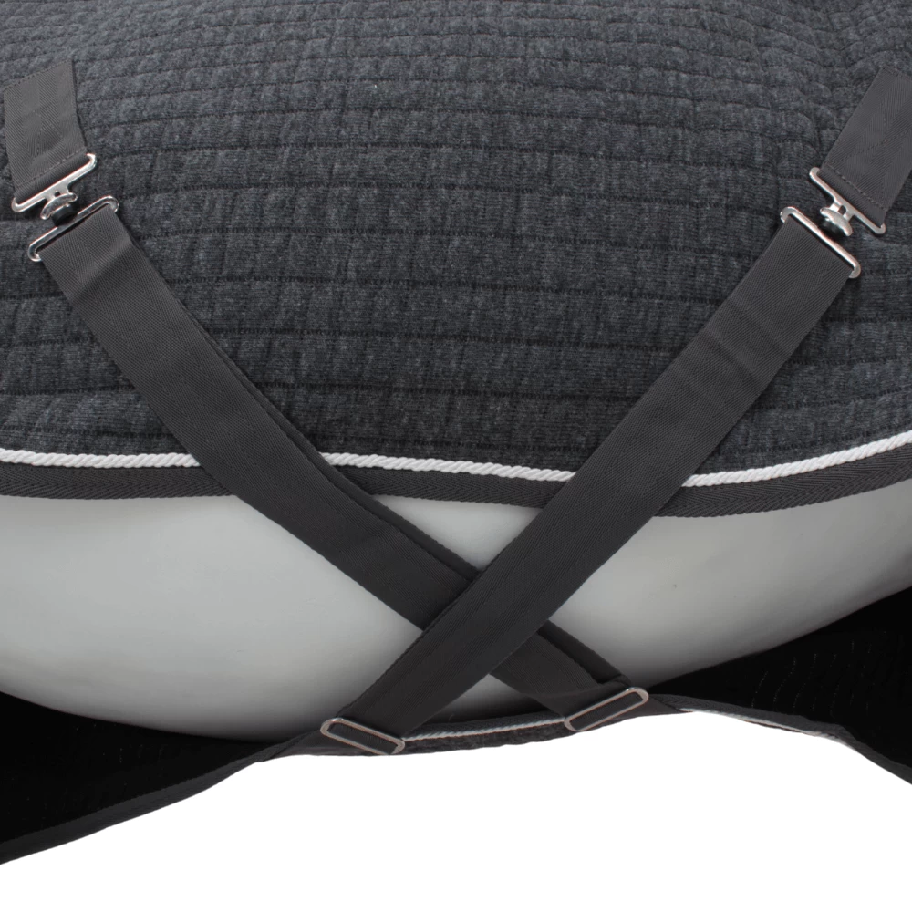 Im Frontbereich der Decke wird diese mit einem verstellbaren T-Haken verschlossen. Die Kreuzbegurtung ist tief angesetzt und ebenfalls optimal verstellbar. Ein tief angesetzter Schweifriemen sorgt zusätzlich für den sicheren Sitz der Decke.